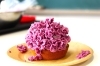 ミニタルトの上においもやクリームをのせ、その上に紫いもペーストであじさいのお花を絞ります♪